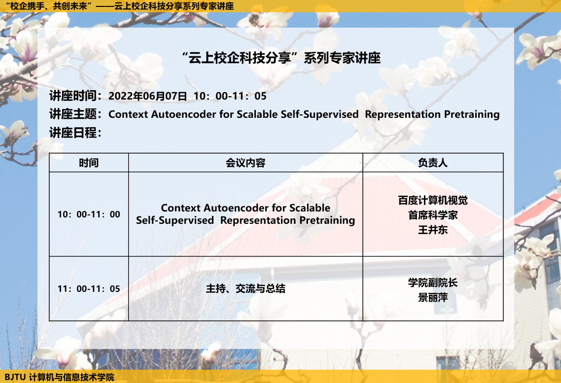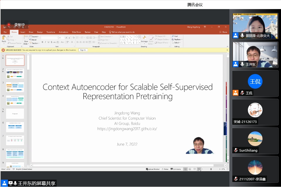 2022年6月7日上午,PA捕鱼官网入口PA捕鱼官方网站“云上校企科技分享系列专家讲座”活动有幸邀请到百度计算机视觉首席科学家王井东,讲座主题为 “Context Autoencoder for Scalable Self-Supervised Representation Pretraining”。160余位师生全程参与讲座。