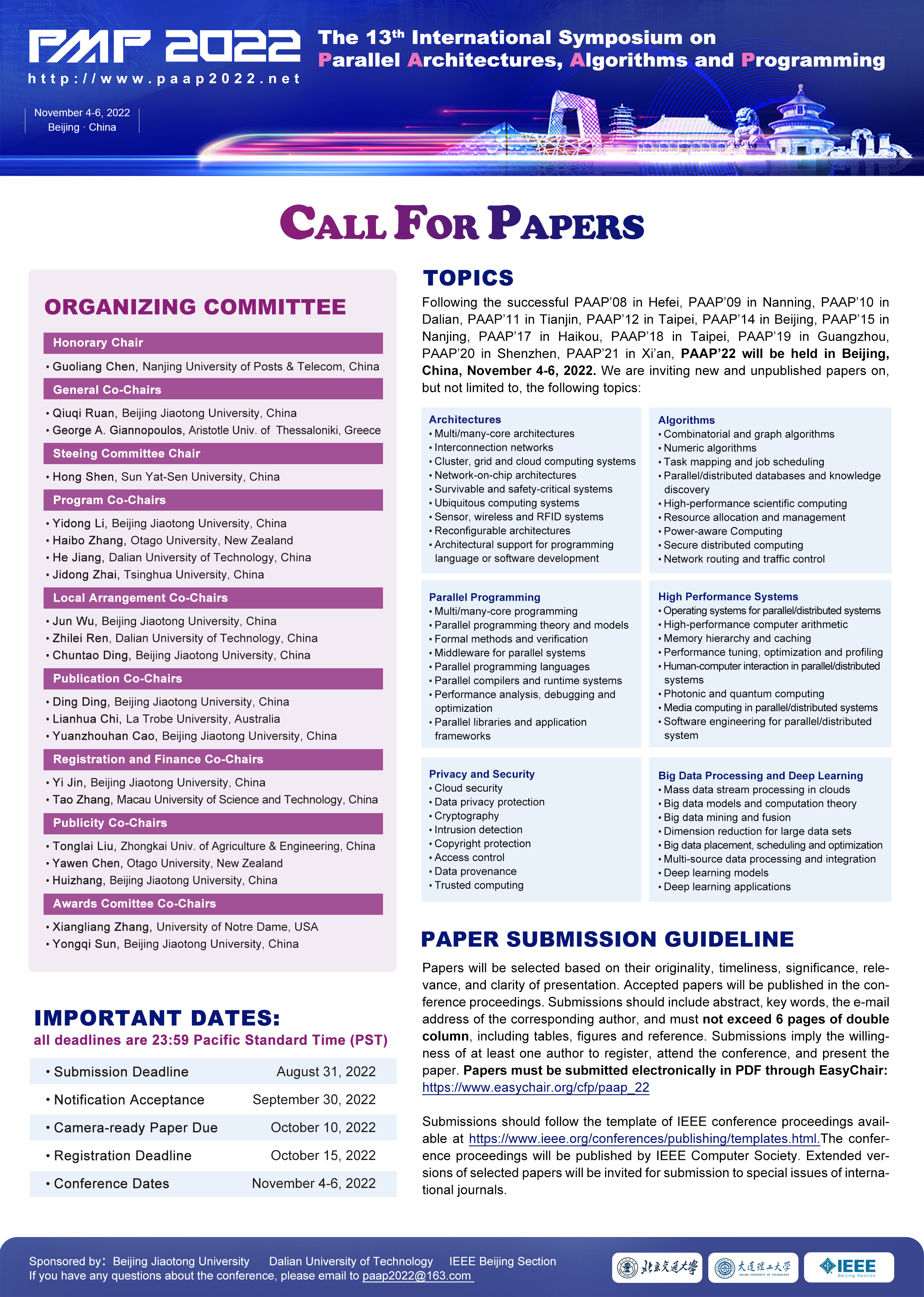 2022年第13届并行结构、算法与程序设计国际会议(PAAP 2022)将于2022年11月在中国北京召开,此次大会由PA捕鱼官网入口PA捕鱼官方网站主办。大会致力于为学术界和工业界的科学家和工程师提供一个论坛,展示他们在并行结构、算法与程序设计各方面的研究成果和开发活动。欢迎各位老师和同学踊跃投稿、参会,共同探讨、交流相关领域的最新研究进展及面临的机遇与挑战。