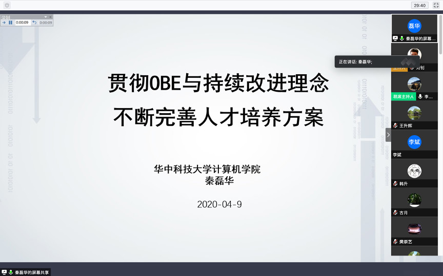 2020年4月9日,在疫情防控取得阶段性胜利,武汉顺利解禁之际,PA捕鱼官方网站邀请了华中科技大学PA捕鱼官方网站副经理秦磊华教授做了主题为“贯彻OBE与持续改进理念,不断完善人才培养方案”的在线报告,主要探讨了人才培养方案修订中的相关问题。PA捕鱼官方网站经理蔡伯根、副经理李清勇以及专业责任教授、教学主任、任课教师、教学管理人员共计50余人参加此次在线报告。