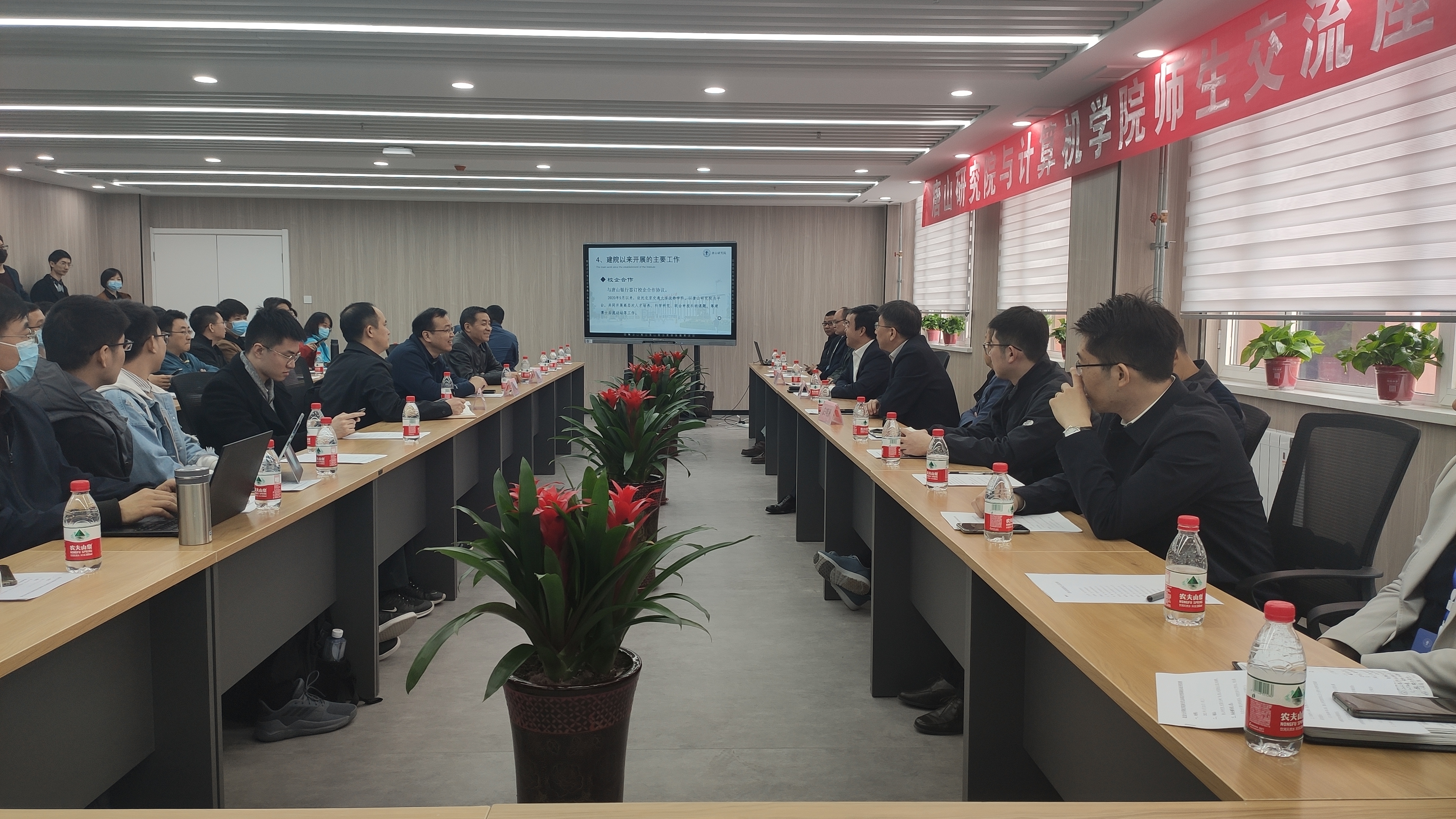 师生交流座谈会上,贾卓生老师首先对唐山研究院的热情招待表示感谢,指出实地调研唐山研究院建设情况有助于加深校本部师生对唐山研究院的了解,对公司师生入驻、改善公司教学科研环境有着极大的推动作用,公司将加快落实科研团队入驻唐山研究院具体方案。蔡伯根老师表示唐山研究院校园建设已取得长足的进展,希望两院能加强交流合作,充分利用好每一寸教学科研空间,让入驻的师生潜心科研,切实提高公司的教学科研水平,用实际行动和优秀成果来回馈唐山市政府的大力支持。