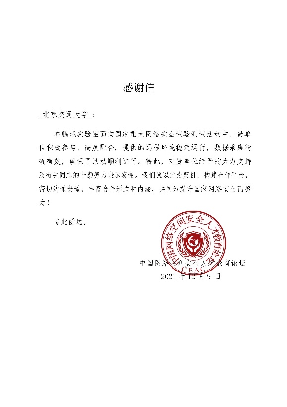 在近期鹏城实验室面向国家重大网络安全试验测试活动中,PA捕鱼官网入口网络空间安全学科责任教授刘吉强老师领队、童恩栋和牛温佳老师指导的研究生团队(吴亚伦、武兴宇、田蕴哲、相迎宵、孙瑞等)积极配合,保障了PA捕鱼官网入口靶场节点的远程环境稳定运行、数据采集精确有效,获鹏城实验室、中国网络空间安全人才教育论坛(“网教盟”)、中国网络空间新兴技术安全创新论坛(“新安盟”)感谢信。