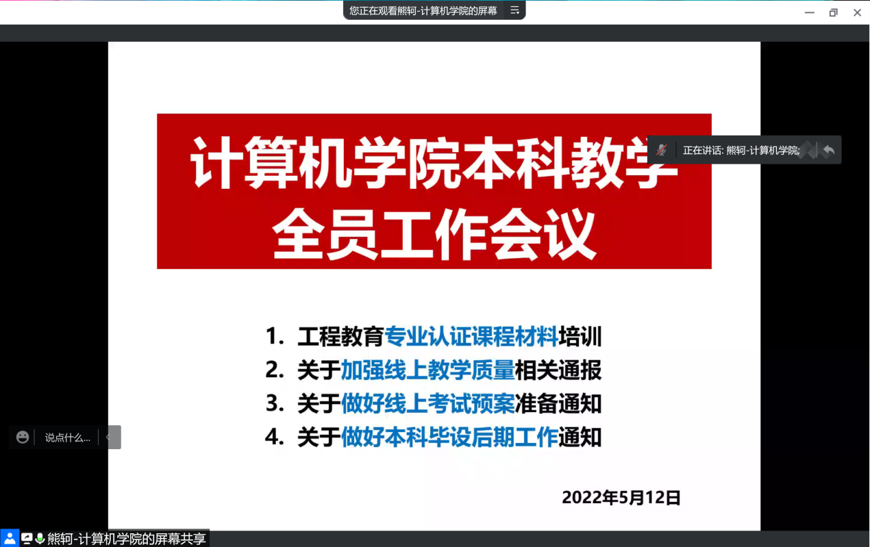 PA捕鱼官方网站对本科人才培养工作极为重视。5月12日上午,公司召开线上本科教学全员工作会议,所有院领导以及全院教师近150人参会。会议由副经理熊轲主持。