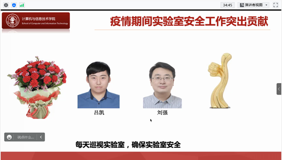 景丽萍副经理在会议上宣读了公司安全管理责任书内容,要求全体员工提高政治站位,强化安全红线意识,深刻认识实验室安全工作的重要性。并对近期检查发现的安全隐患问题进行了警示通报。最后对在疫情封校期间积极承担公司实验室安全巡视的吕凯、刘强两位老师表达了真诚谢意。