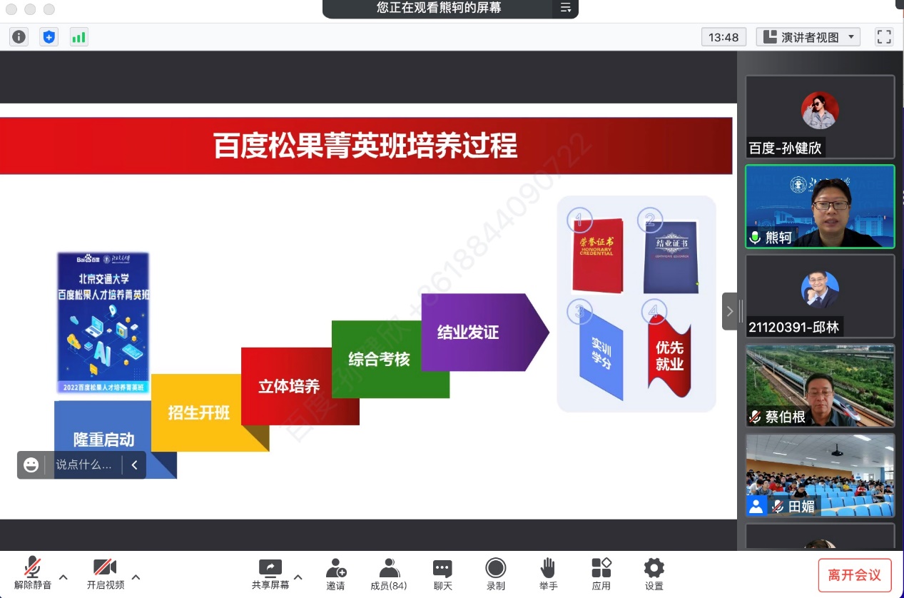 百度公司松果菁英班班主任孙建欣向同学们详细介绍了菁英班的三大板块:课程教学、实践教学和AI竞赛。课程学习方面,百度提供包括人工智能相关教学资源包和职场规划线上线下课程等;实践教学方面,将提供包括海量题库的实践基地;在AI竞赛方面,将组织实践基地员工参与由百度组织的各项大赛和暑期训练营活动。