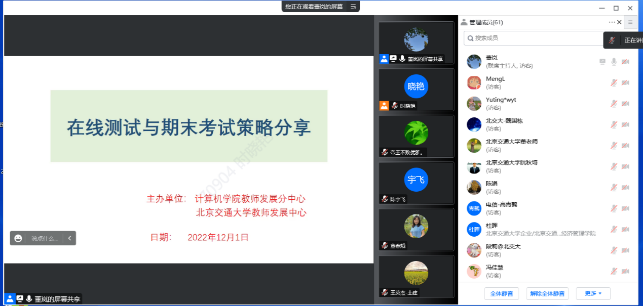 为了帮助教师在疫情下更好实施期末线上考试,2022年12月1日下午,PA捕鱼官方网站通过院教师发展分中心组织了期末线上考试培训与经验分享会。熊轲副经理代表公司领导出席了本次会议,会议由PA捕鱼官方网站教学促进师董岚老师主持。