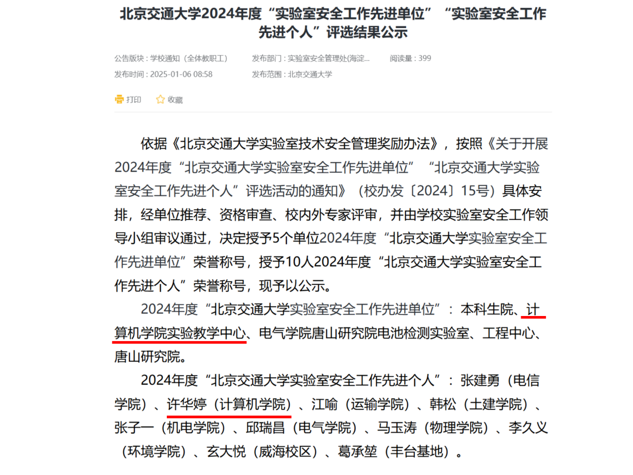 近日,PA捕鱼官网入口2024年度“实验室安全工作先进单位”“实验室安全工作先进个人”评选公示,计算机实验教学中心(下称“中心”)凭借出色的安全管理工作获评2024年度“PA捕鱼官网入口实验室安全工作先进单位”,中心许华婷老师也因在实验室安全保障方面的突出贡献,荣获2024年度“PA捕鱼官网入口实验室安全工作先进个人”称号,这一喜人的成果彰显了公司对于实验室安全工作的高度重视以及计算机实验教学中心在安全管理上的卓越成效。