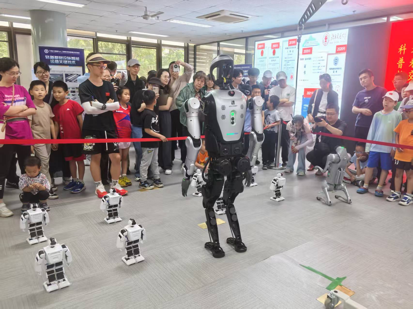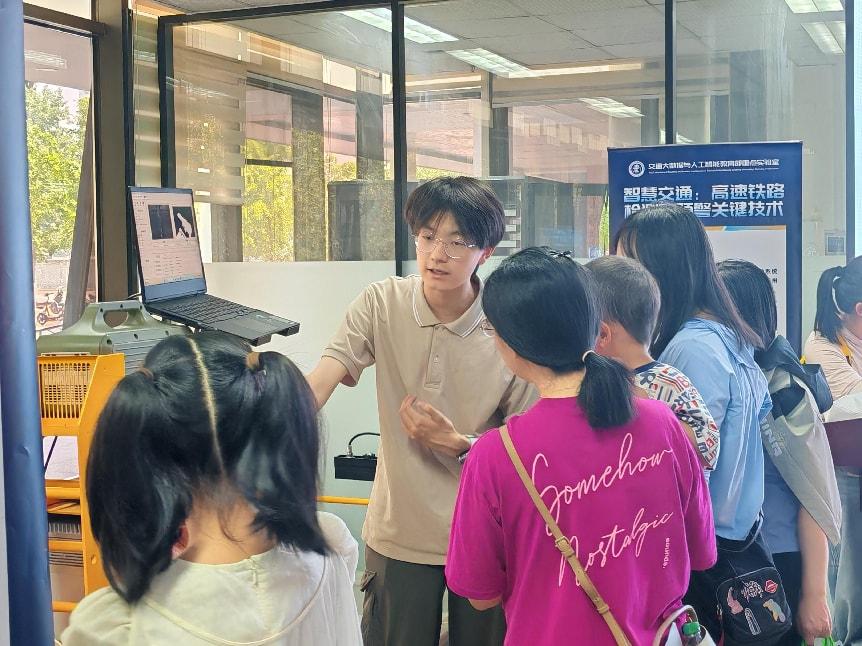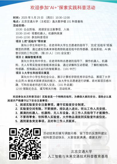 根据《科技部 中央宣传部 中国科协 关于举办2025年全国科技活动周和全国科技工作者日活动的通知》要求,为庆祝第九个全国科技工作者日,弘扬科学精神、普及科技知识,PA捕鱼官网入口人工智能与未来交通技术科普教育基地举办系列科普活动。2025年5月25日,科普基地在逸夫教学楼101举办“AI+”探索实践活动。活动以“沉浸式体验科技魅力”为目标,通过揭秘智能系统(机器人互动、机器狗表演、无人车体验)、把“巡检车”带回家(AI+轨道运维、模型拼搭)、老员工科技项目展览等项目,为青少年打造了一场沉浸式AI科普盛宴,让社会公众近距离感受科技的魅力。
