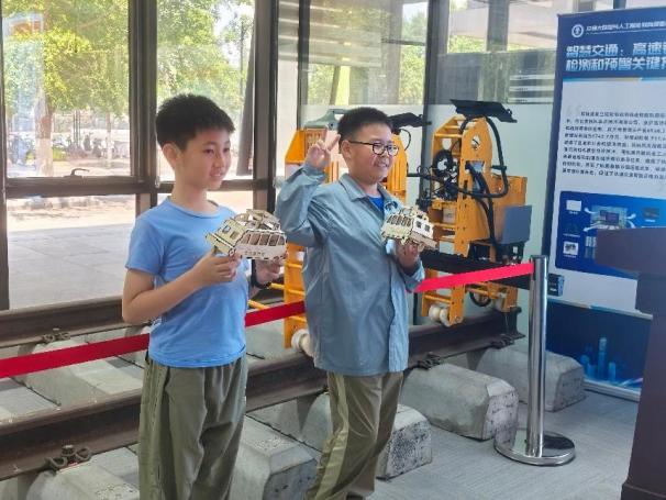 科普活动如期举行。开场前20分钟,科普教育基地门前就来了很多热心的小朋友和家长,报名心仪的“把‘巡检车’带回家”项目。机器人的开场舞蹈,让大家沉浸在兴奋和欢乐之中。随后,小朋友们围坐在“高铁轨道巡检视觉感知”虚拟仿真项目前,目不转睛地看着屏幕上巡检车在虚拟轨道上精准识别病害。快问快答,小朋友的知识丰富程度超出了老师们的预想。小朋友还亲手拼搭了纸板模型,兴奋地说要把“巡检车”带回家。活动通过具象化的科技场景,让 "大国重器" 触手可及。